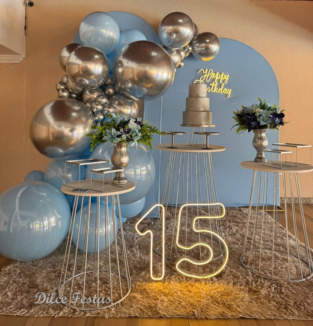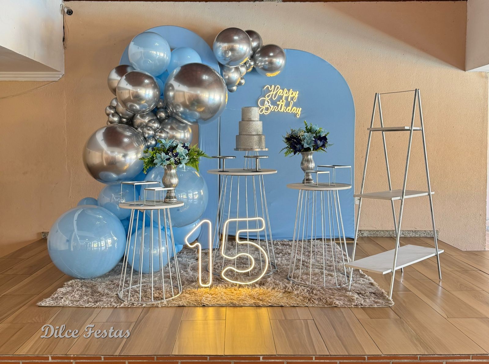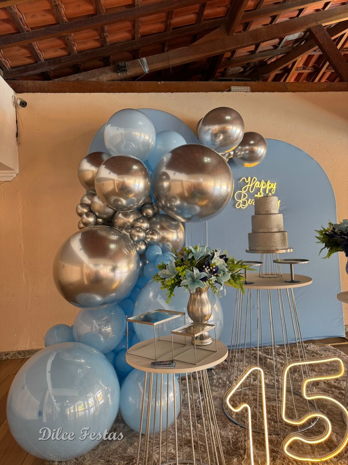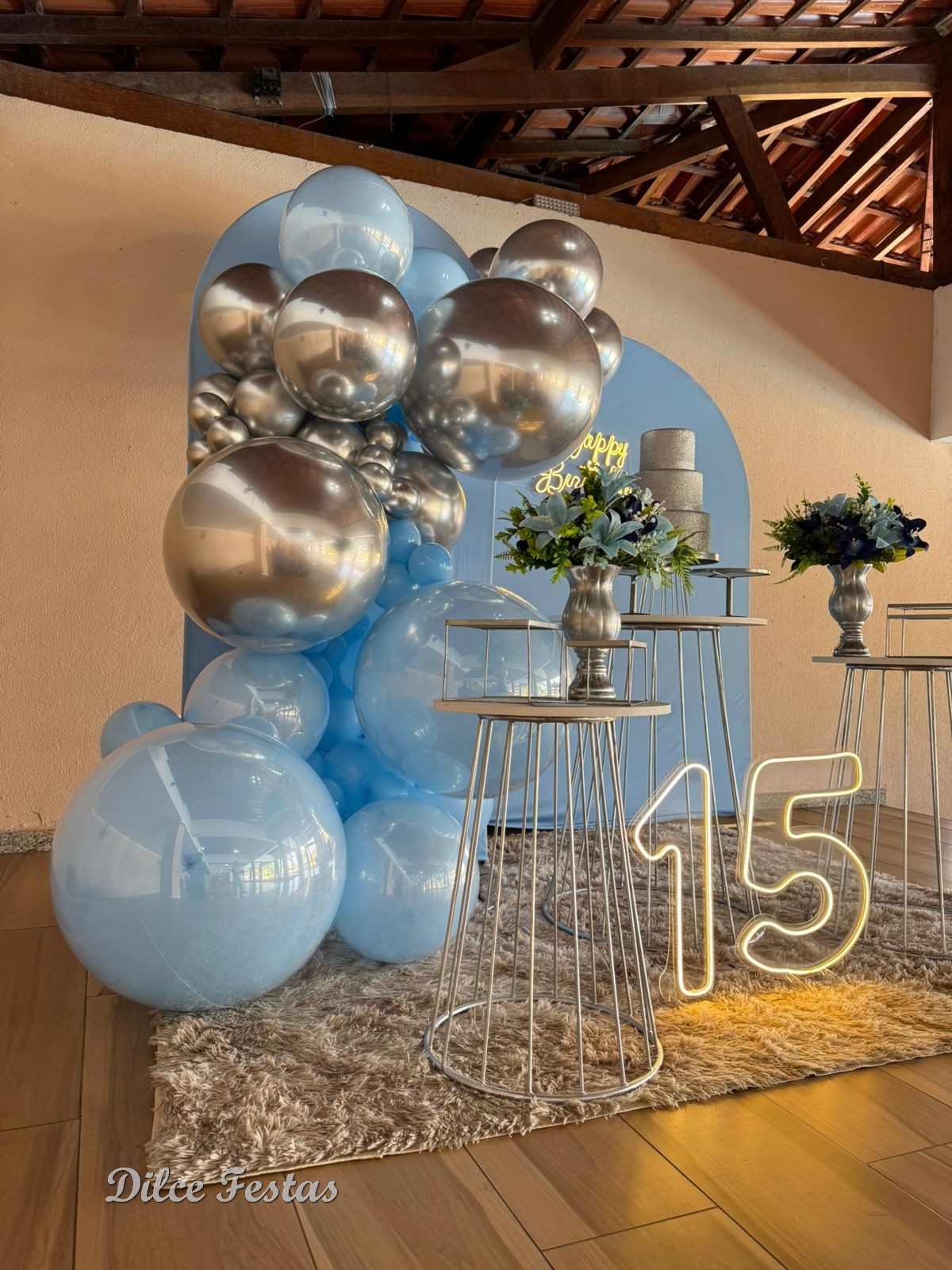 15 Anos – Adulto – Azul Claro E Prata – Trabalho em Balões com Arco Orgânico