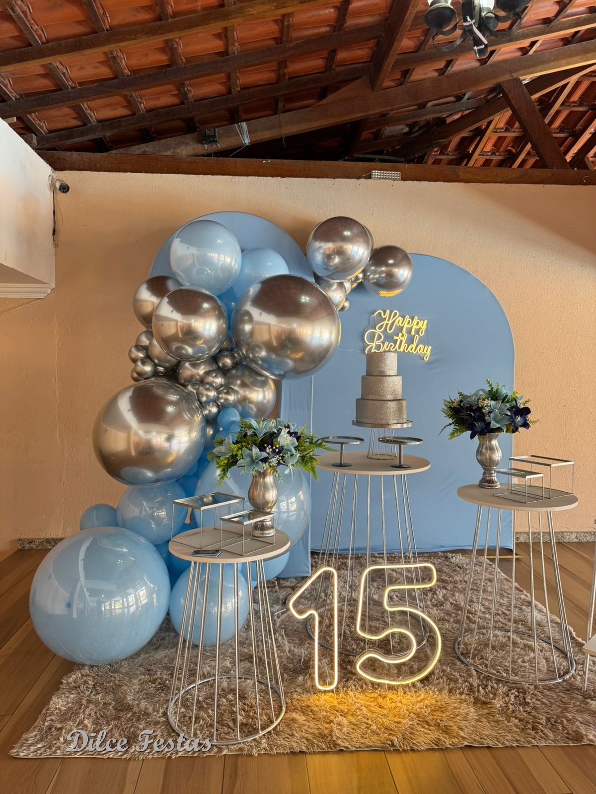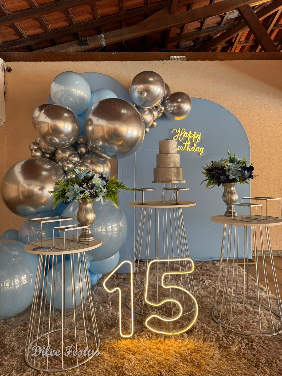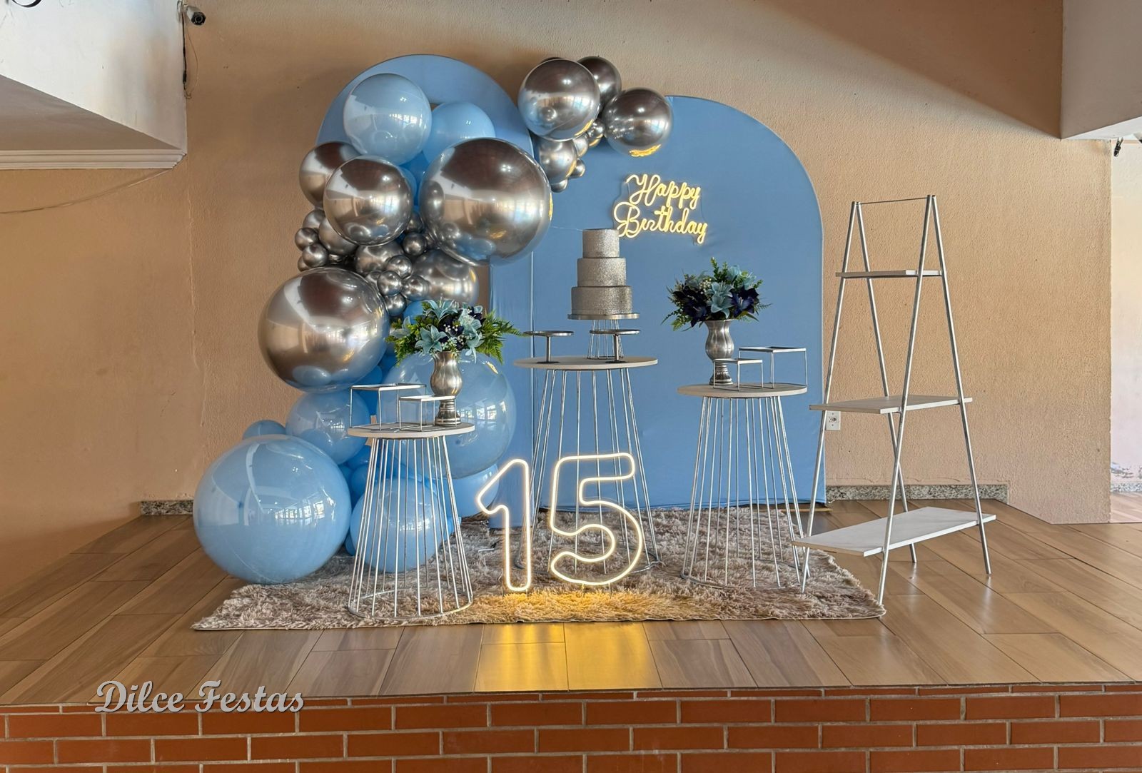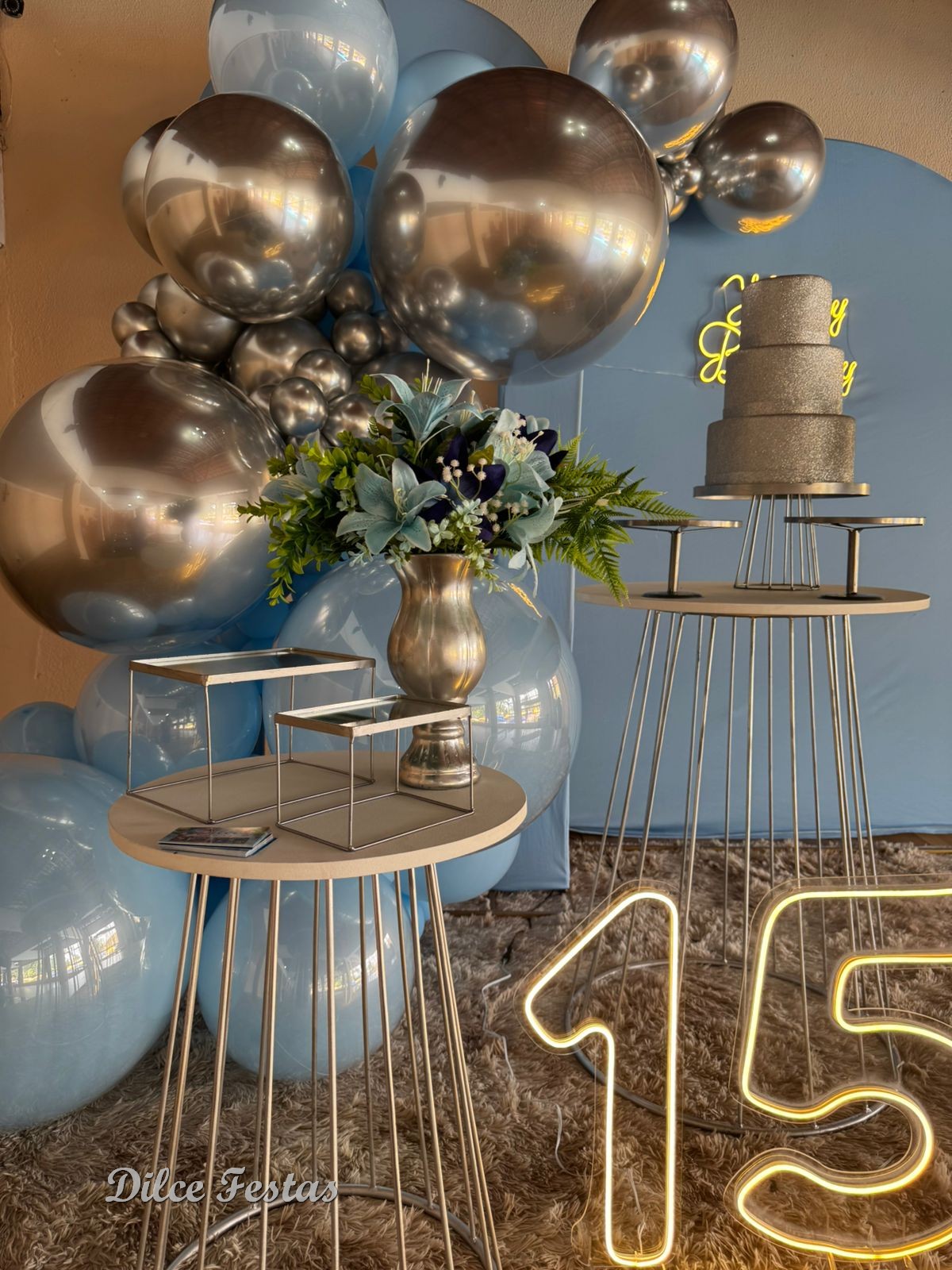 15 Anos – Adulto – Azul Claro E Prata – Trabalho em Balões com Arco Orgânico