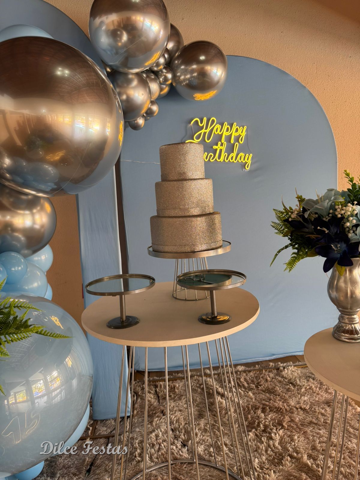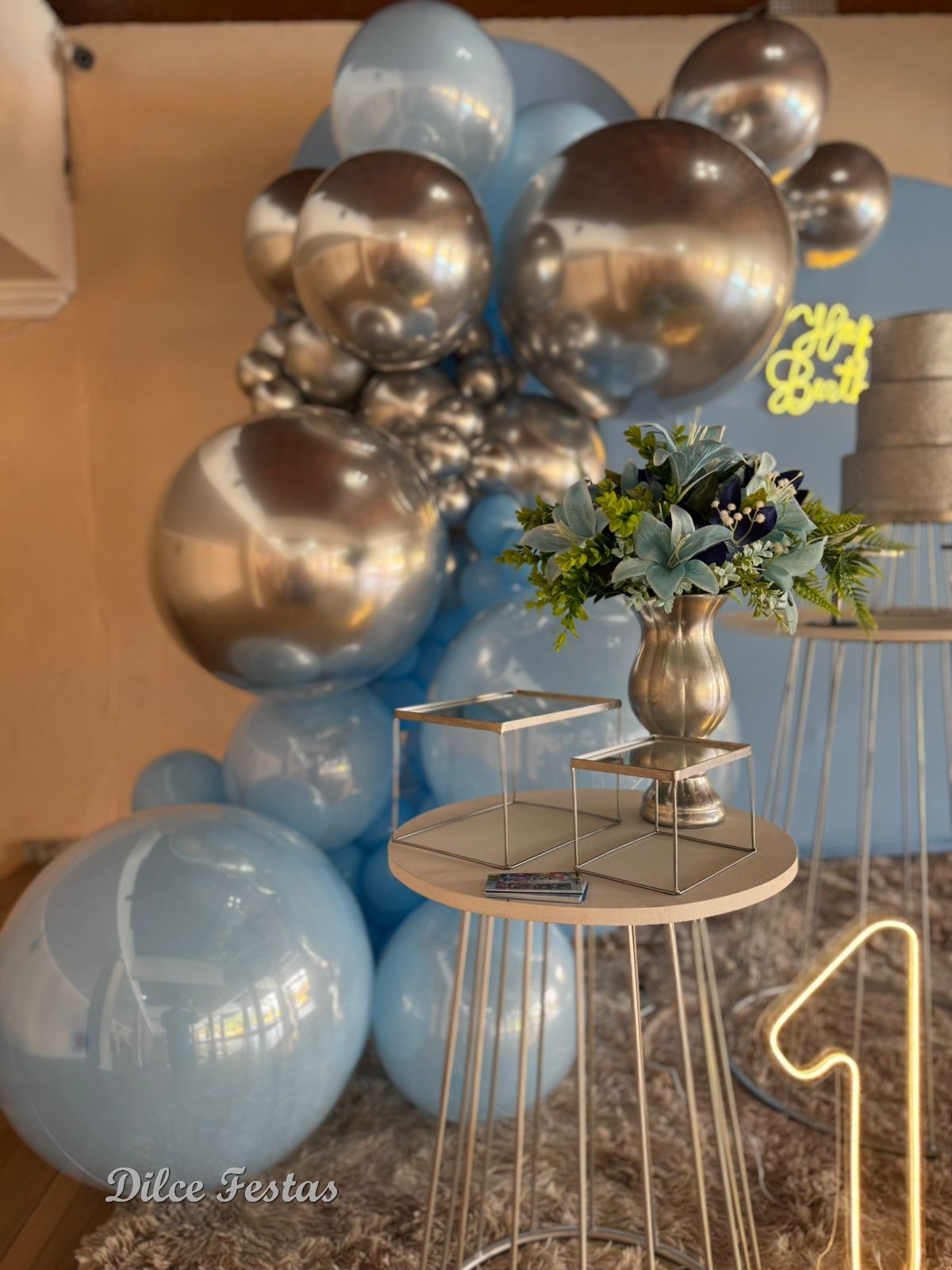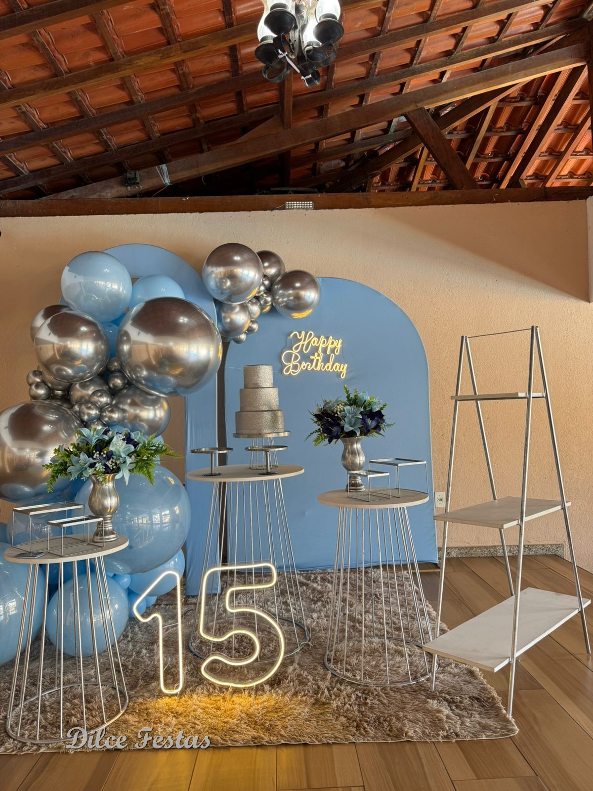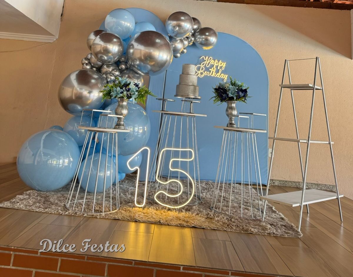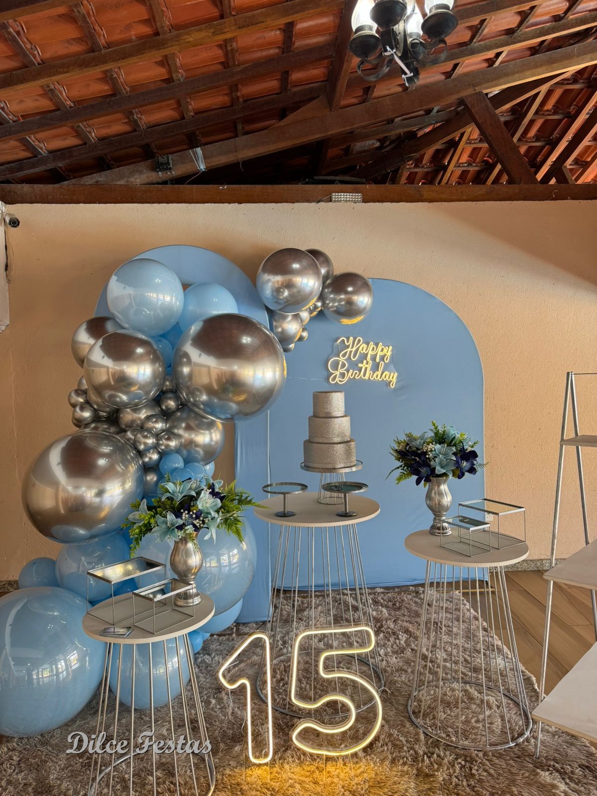 15 Anos – Adulto – Azul Claro E Prata – Trabalho em Balões com Arco Orgânico