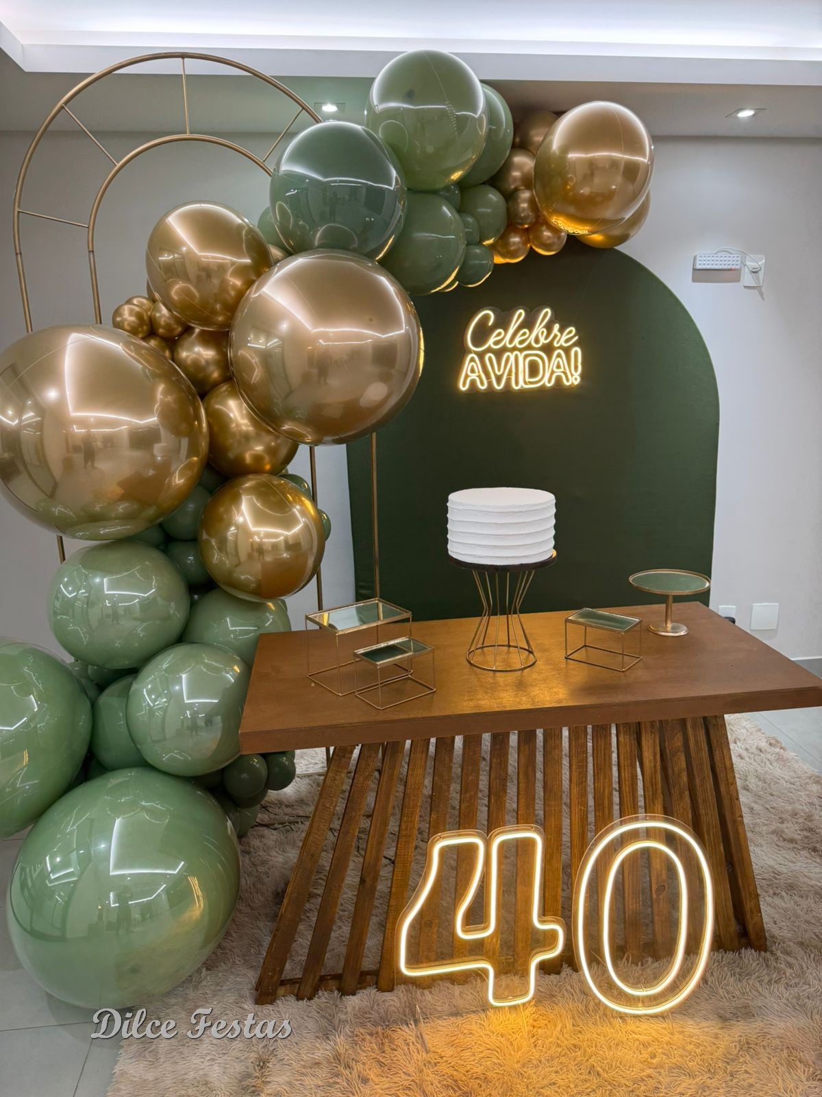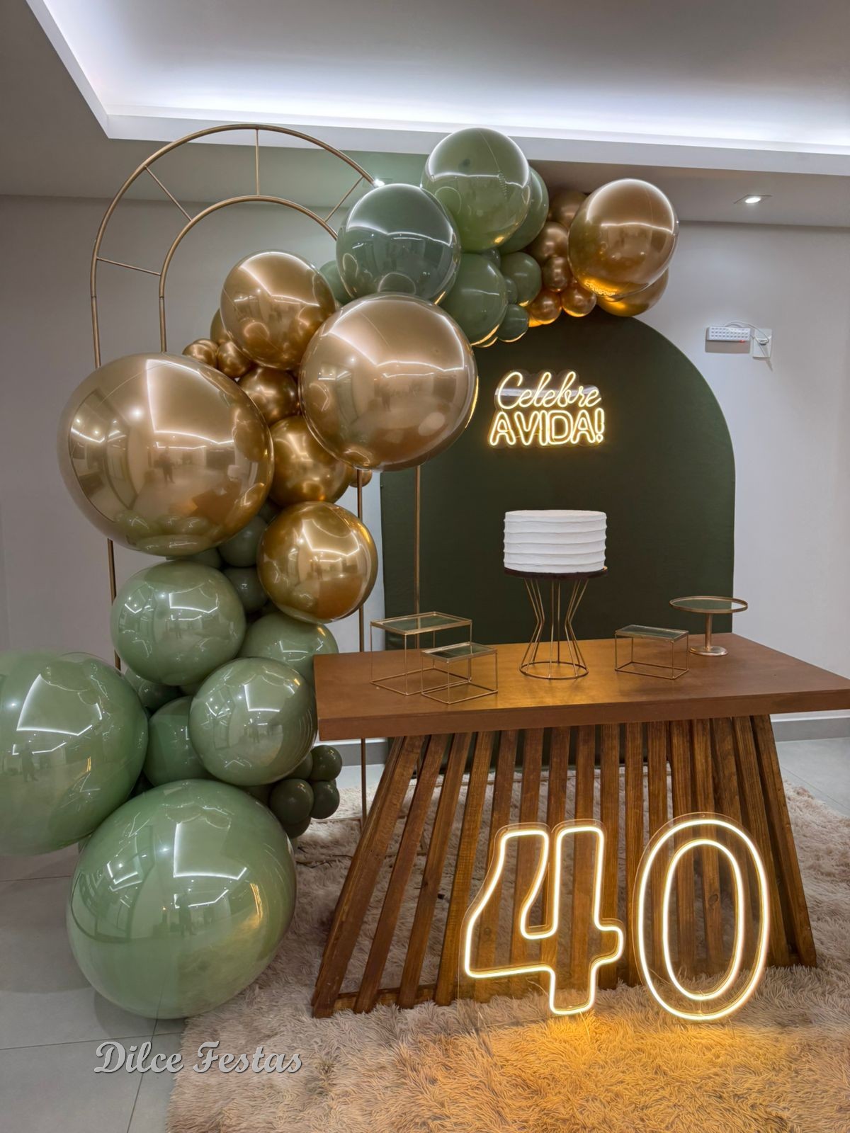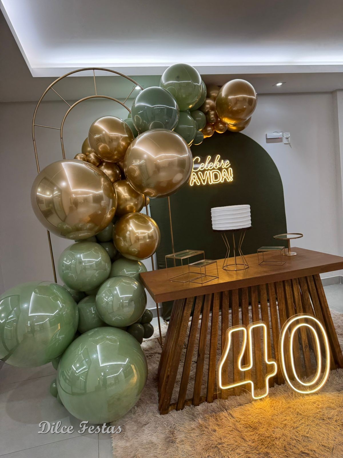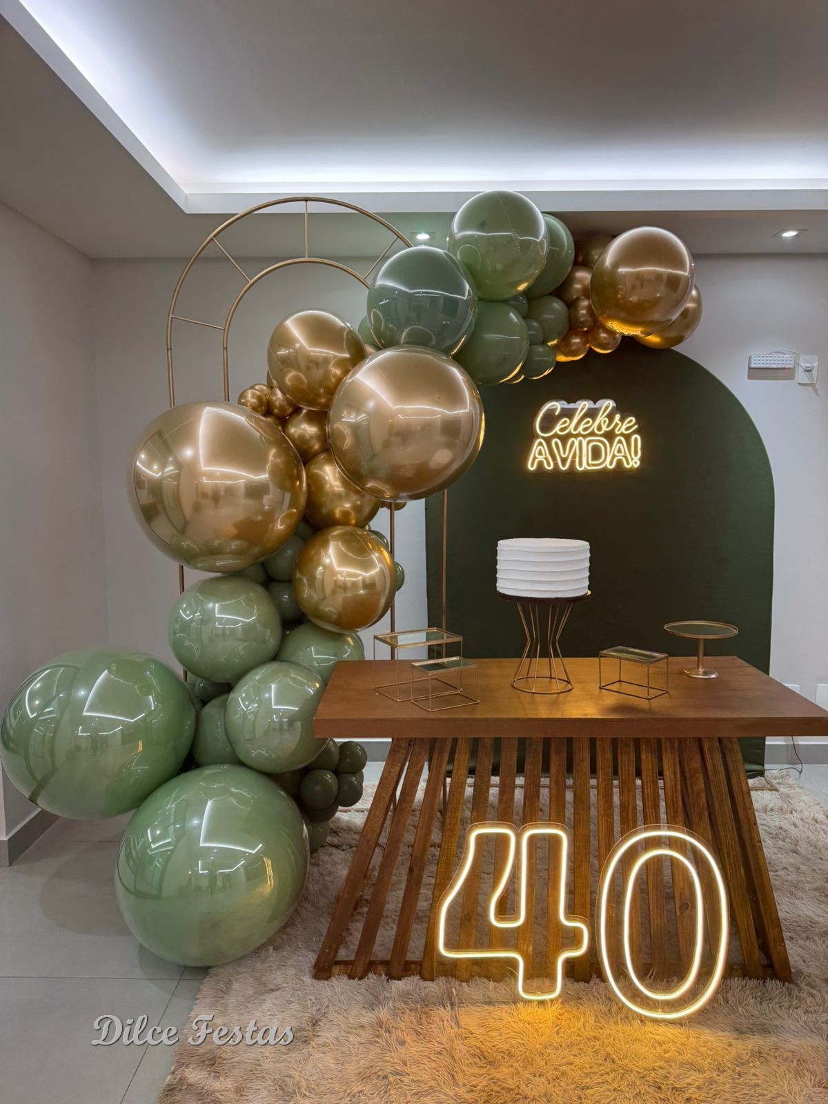 40 Anos – Adulto – Verde Eucalipto e Dourado – Trabalho em Balões com Arco Orgânico