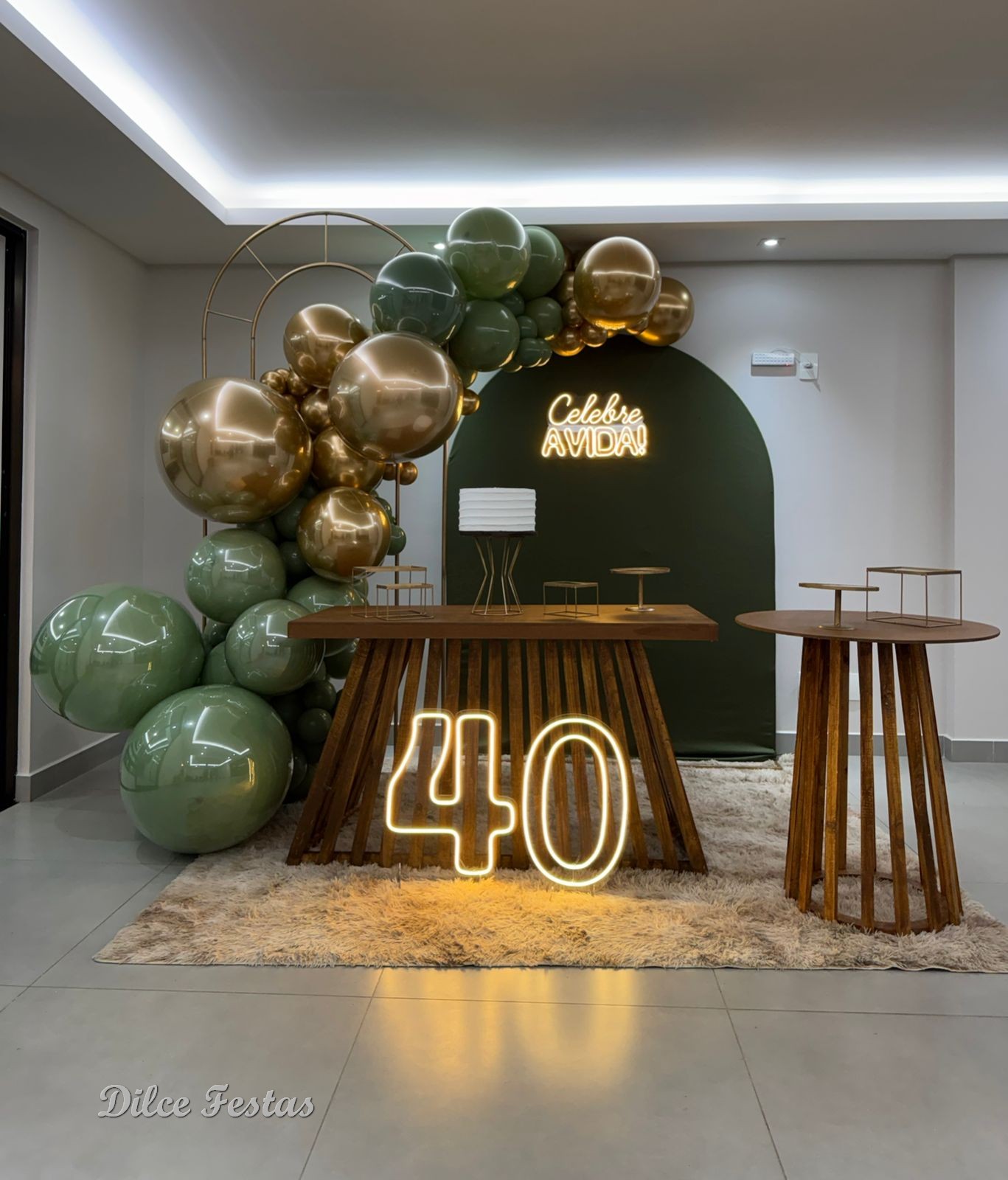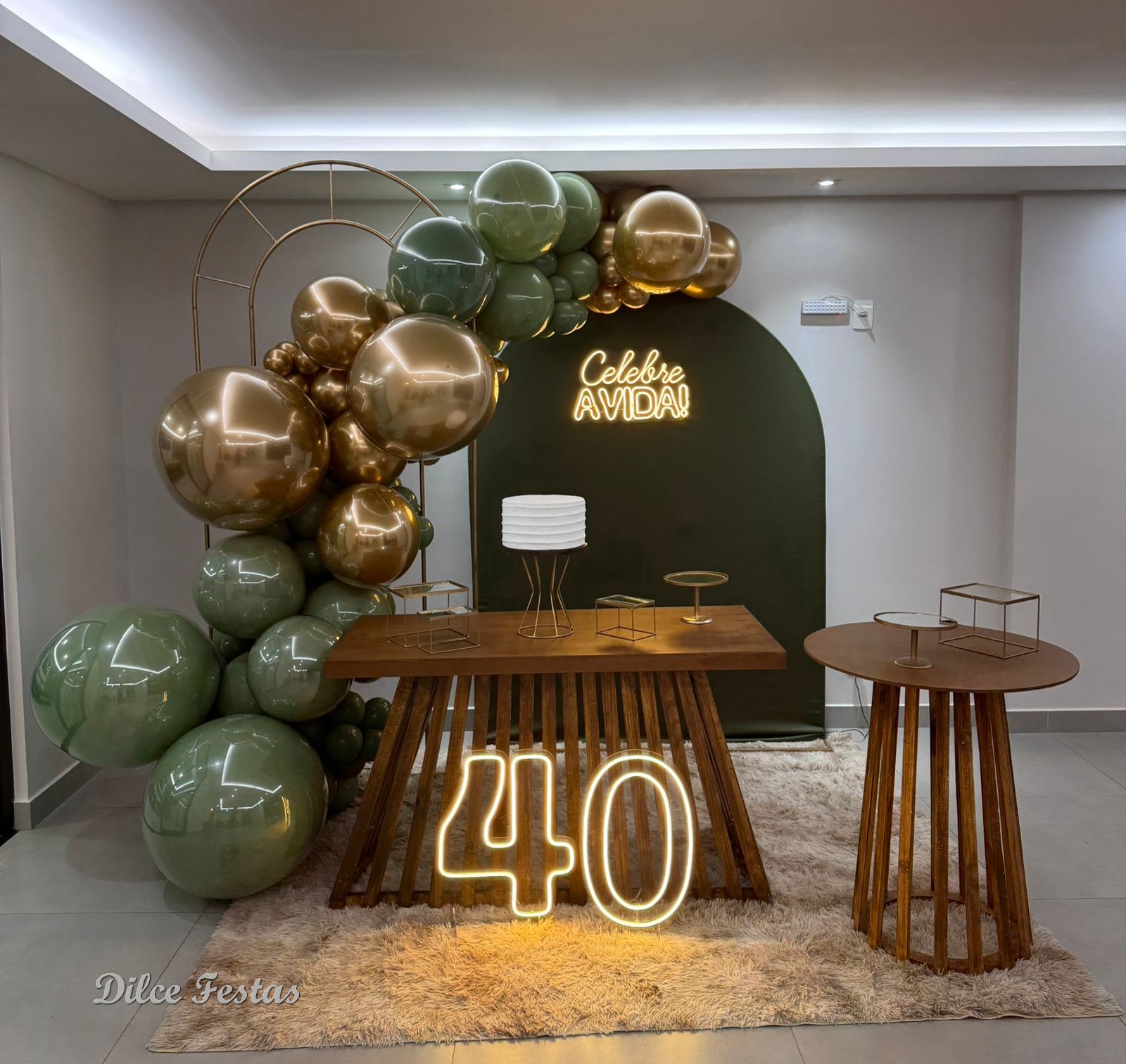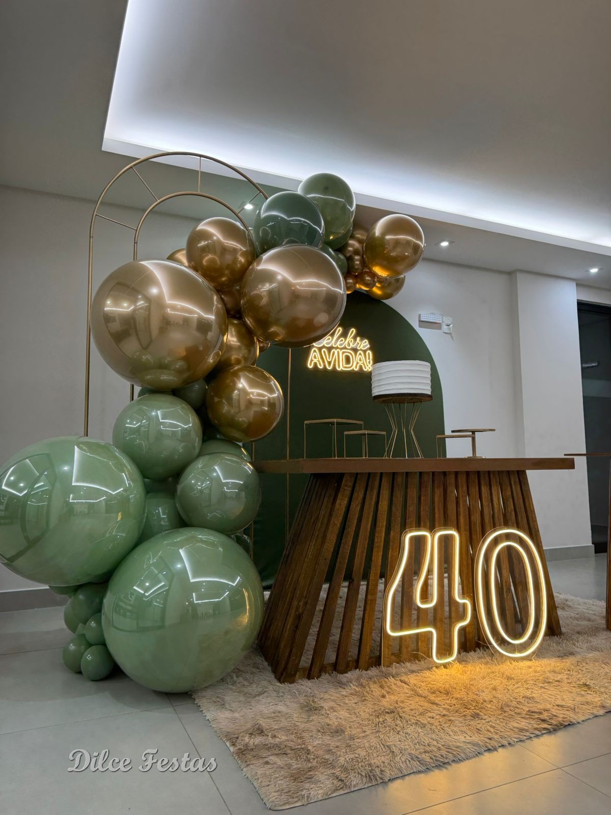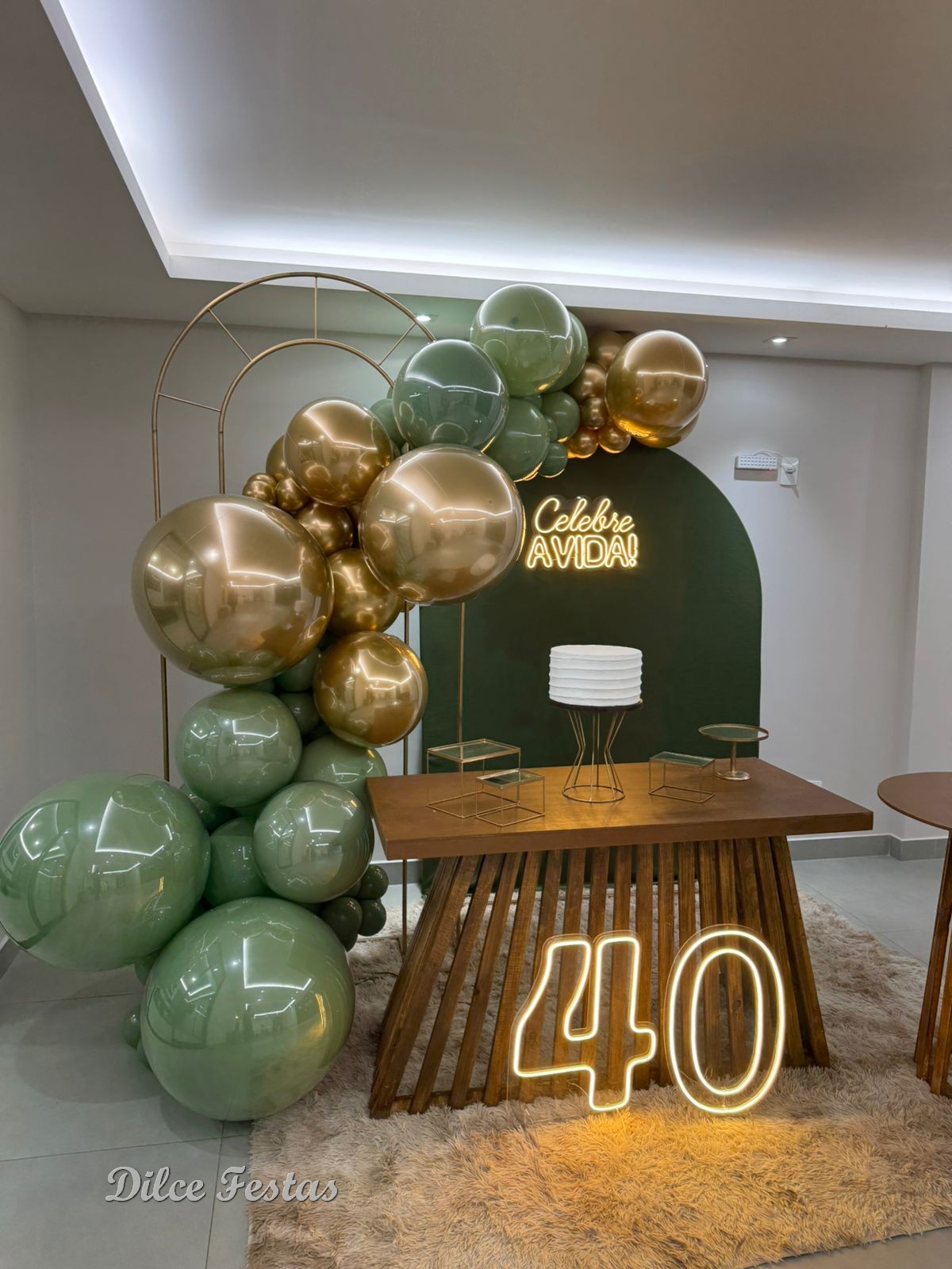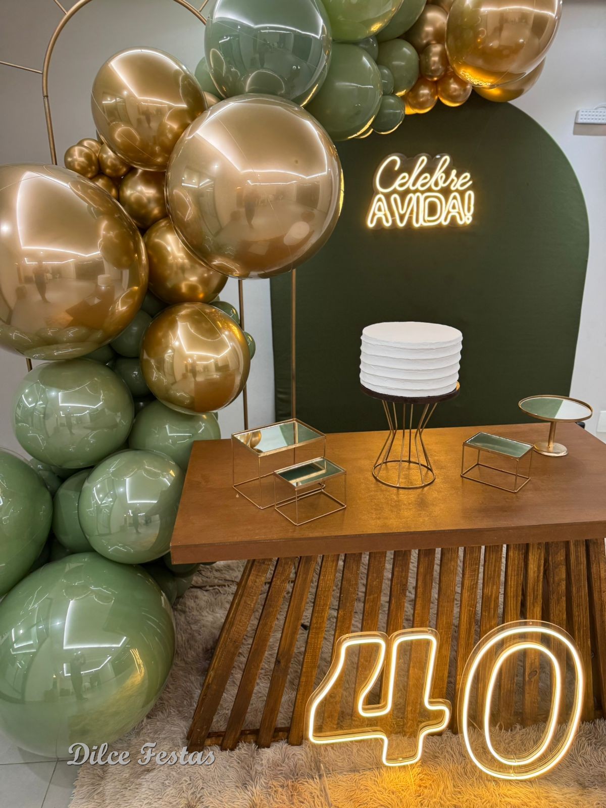 40 Anos – Adulto – Verde Eucalipto e Dourado – Trabalho em Balões com Arco Orgânico