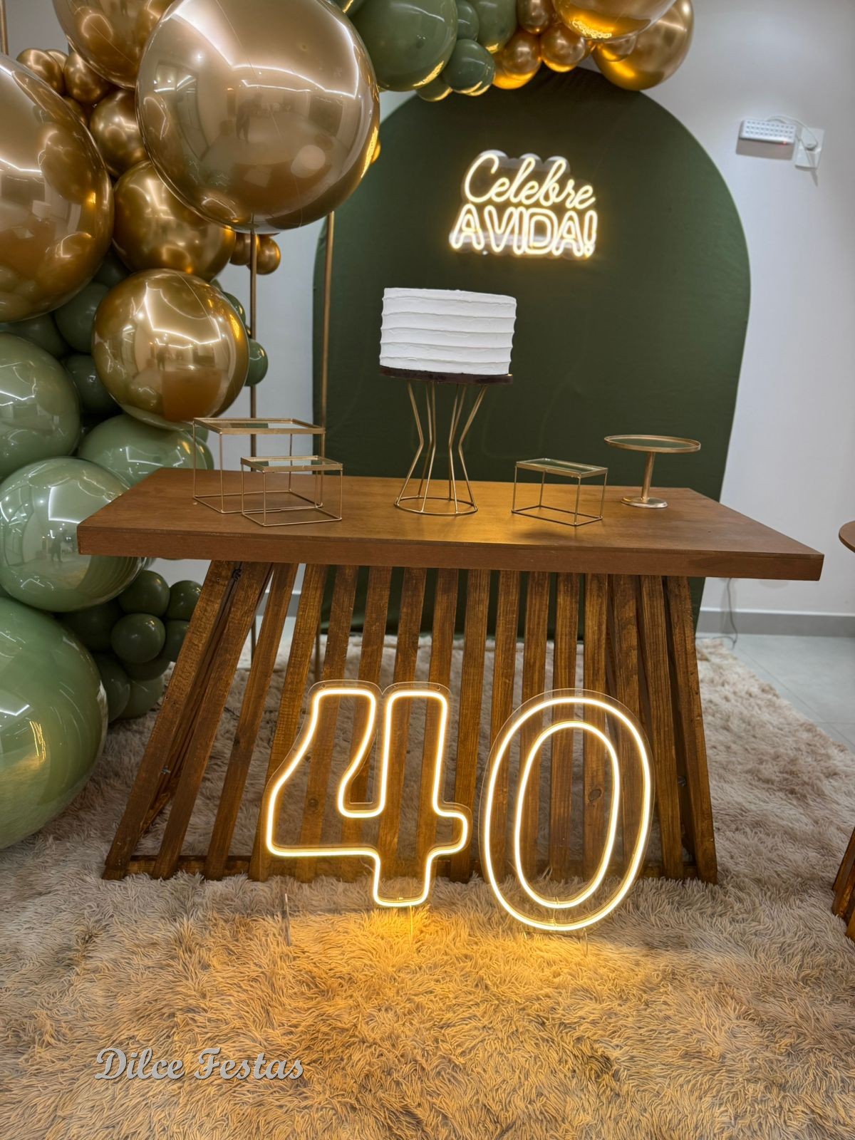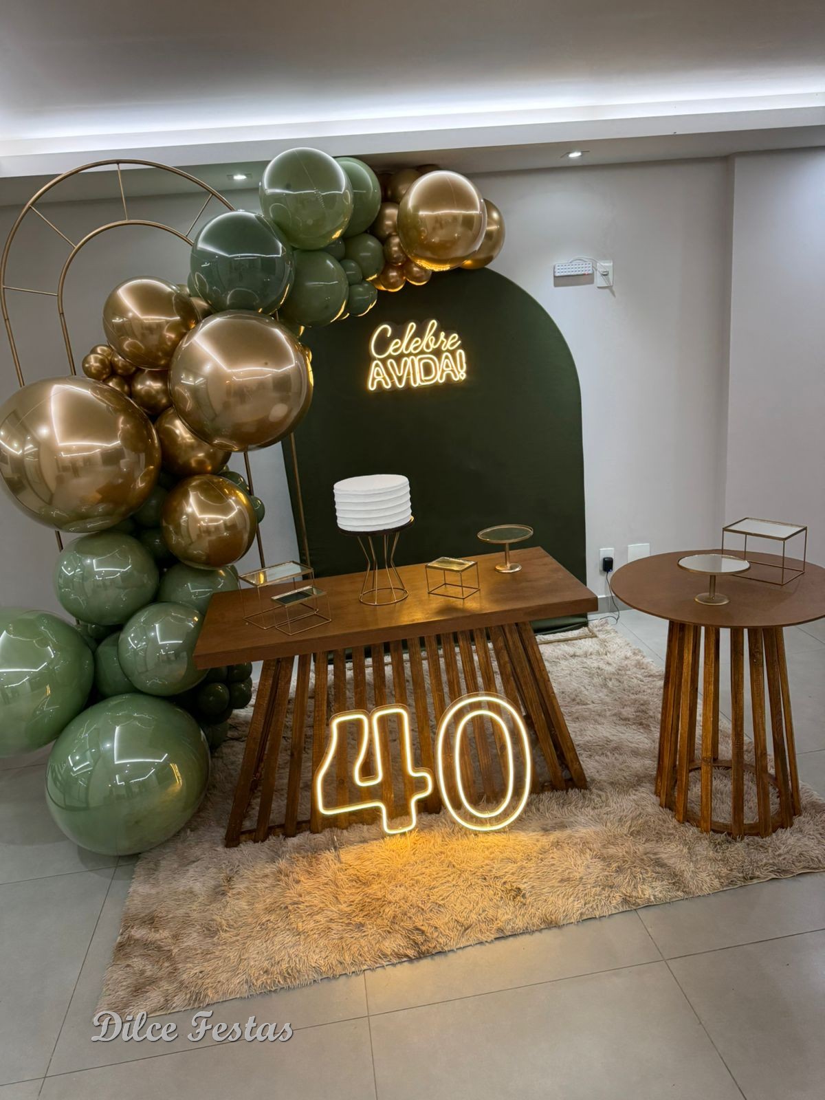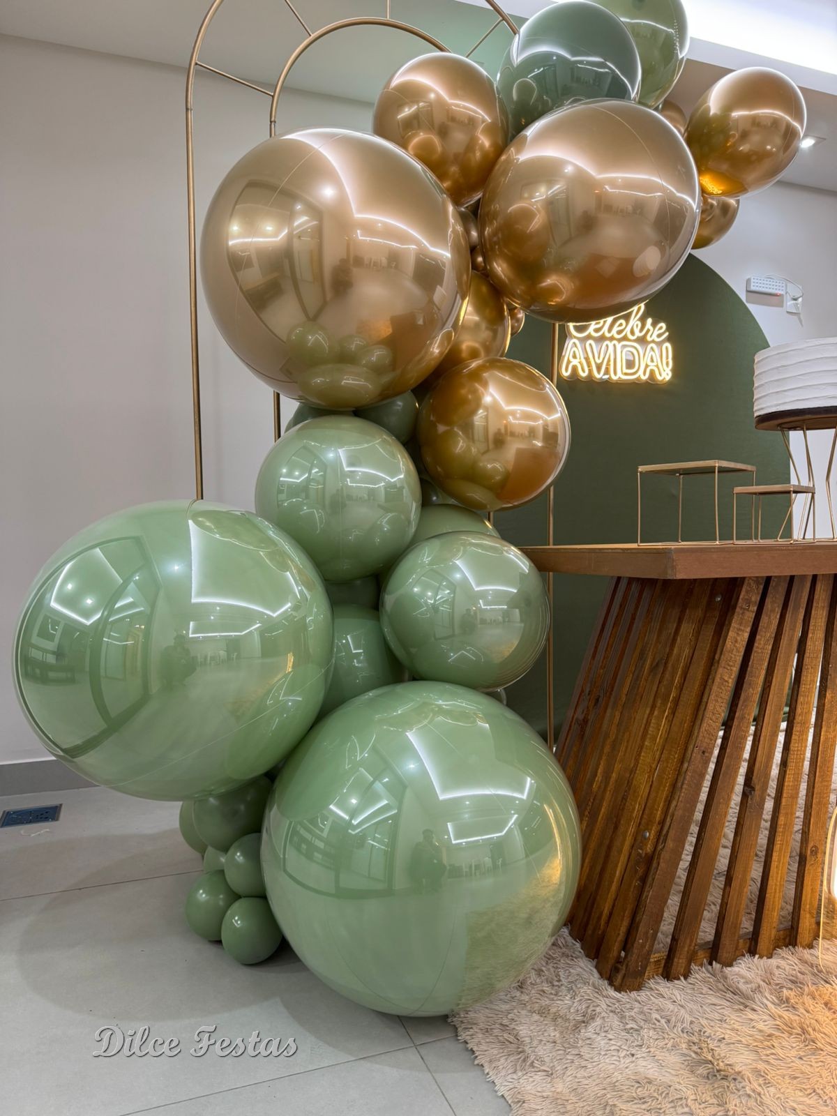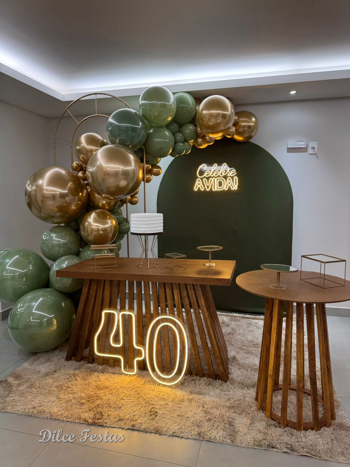 40 Anos – Adulto – Verde Eucalipto e Dourado – Trabalho em Balões com Arco Orgânico