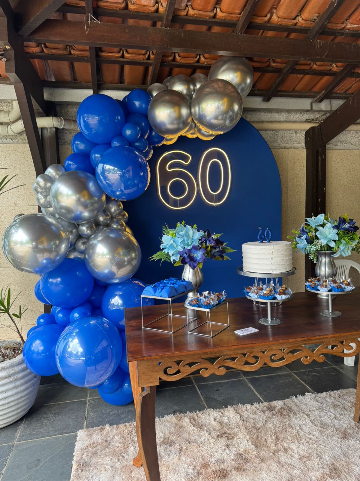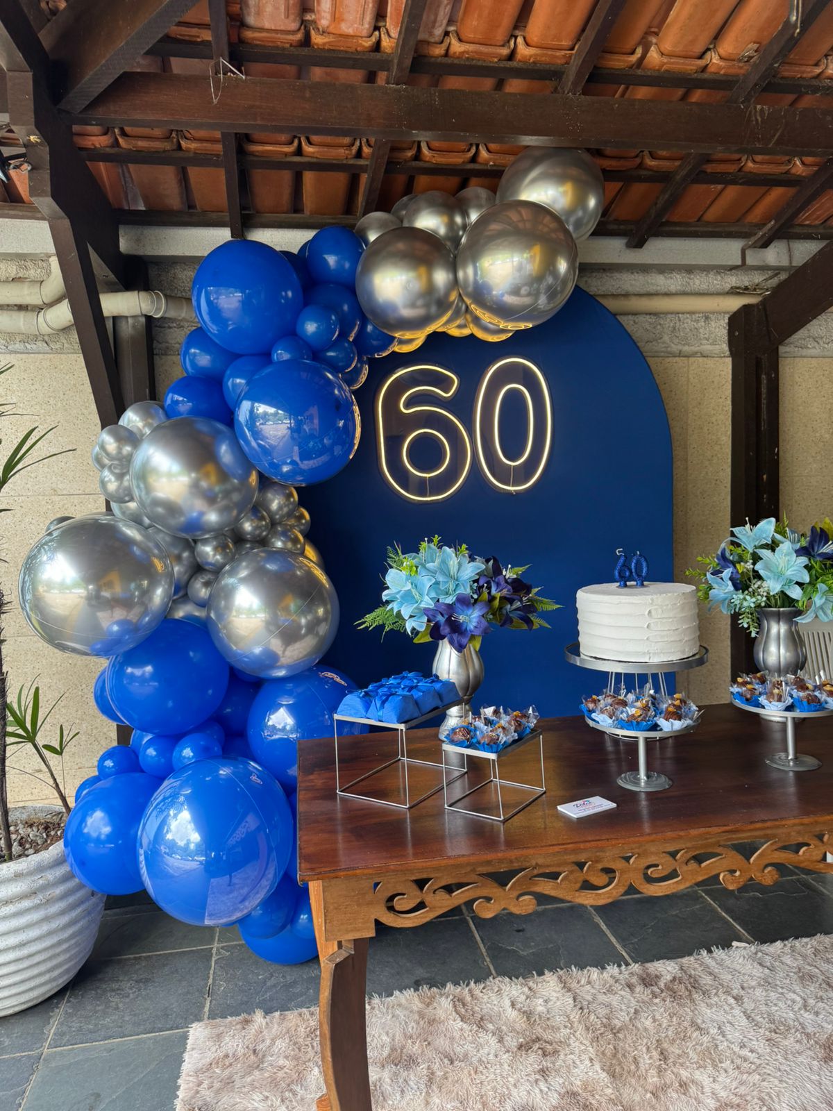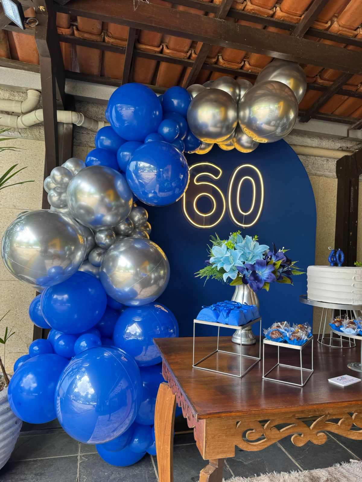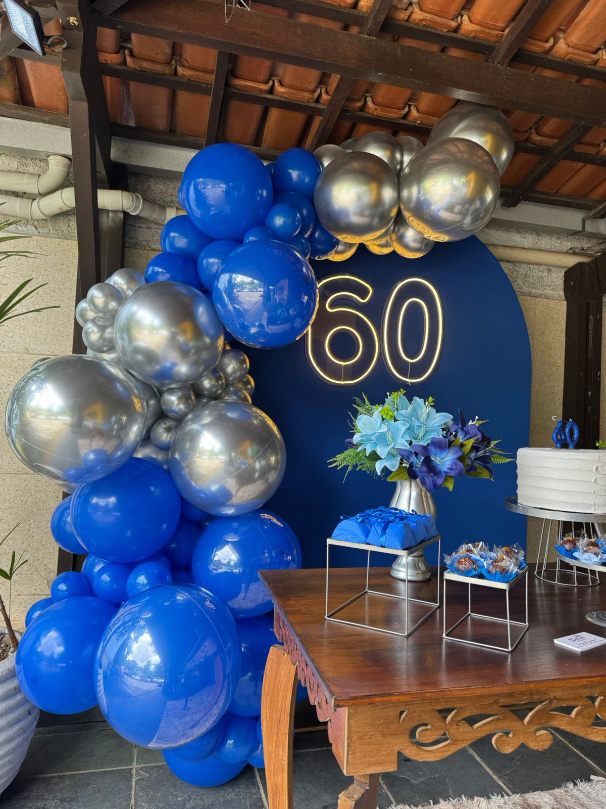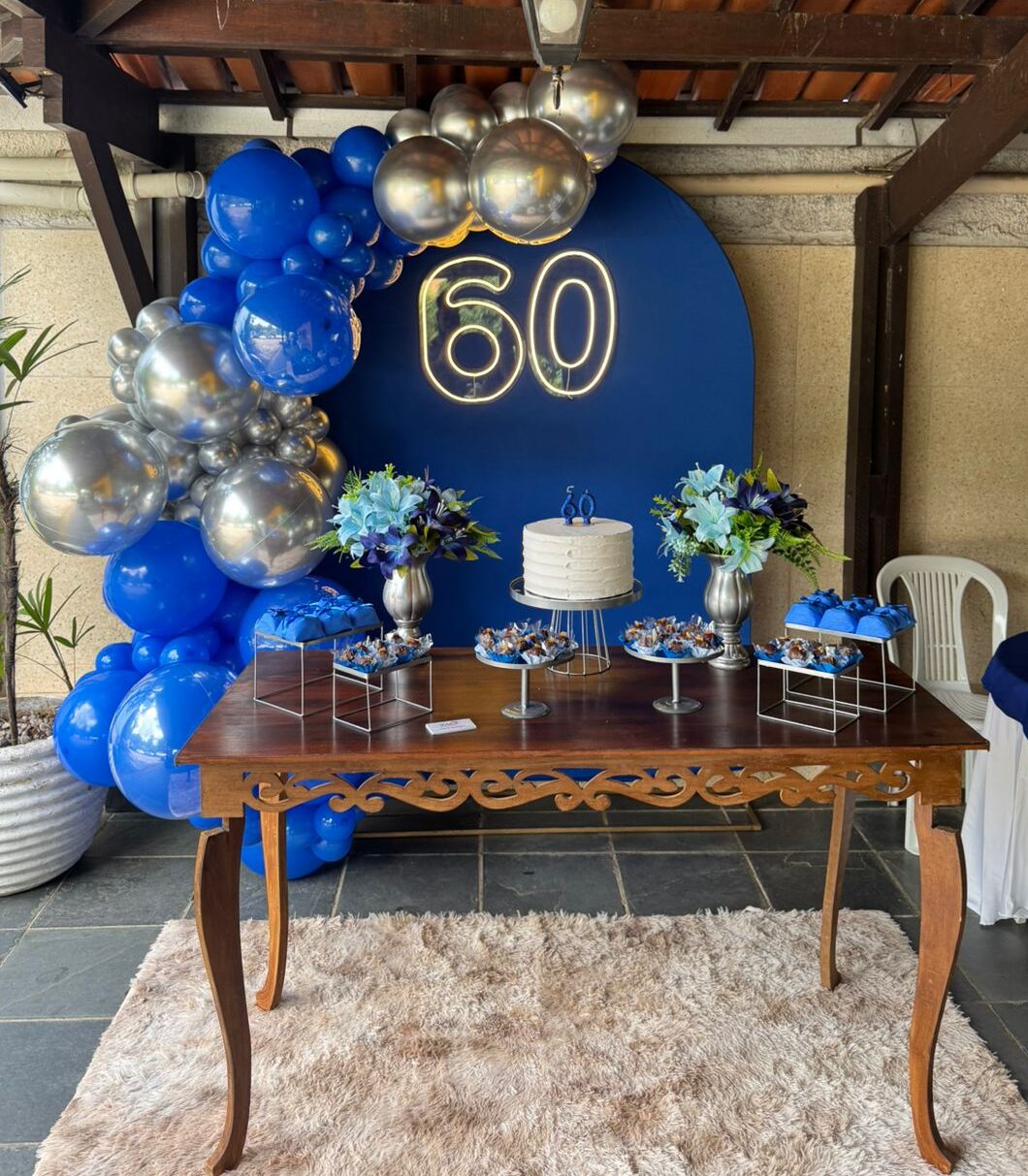 60 Anos Azul Royal e Prata – Adulto – Decoração em Balões com Arco Orgânico