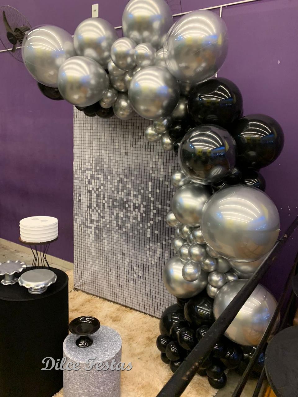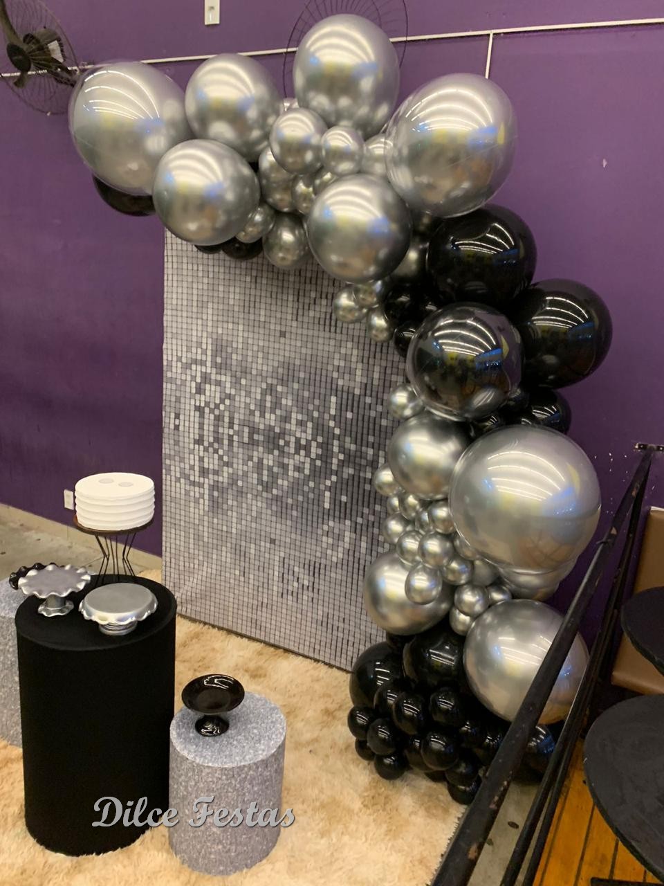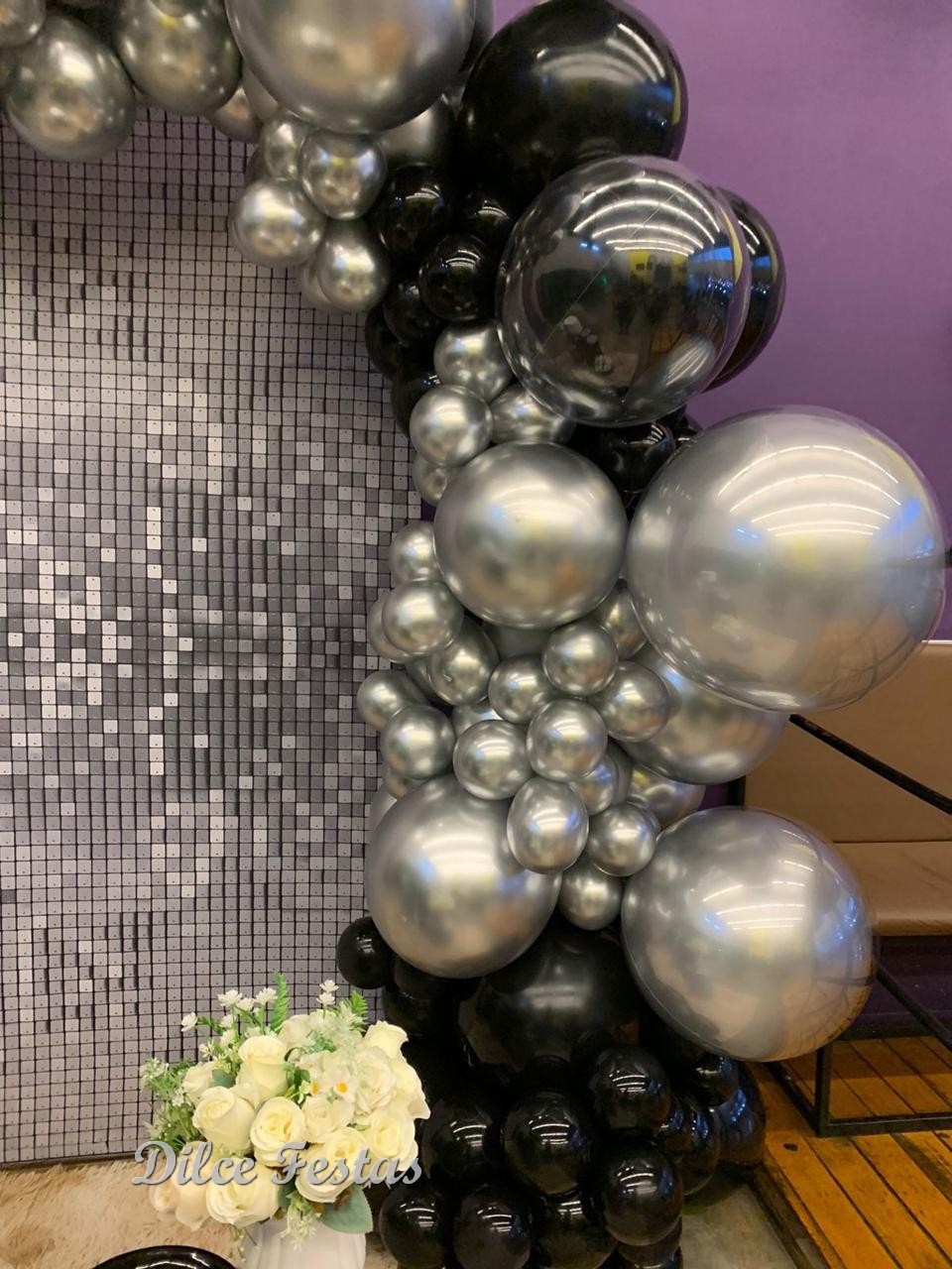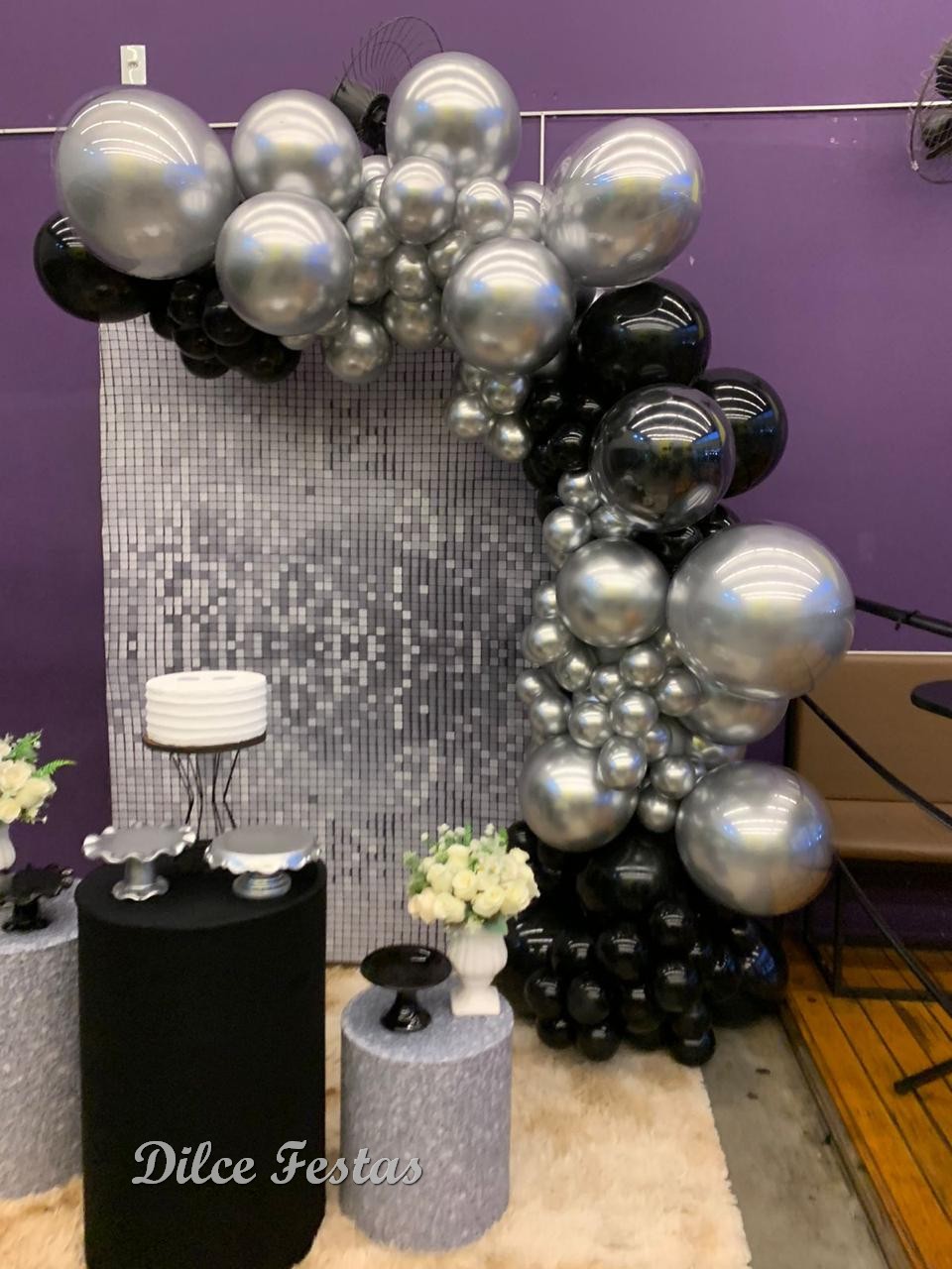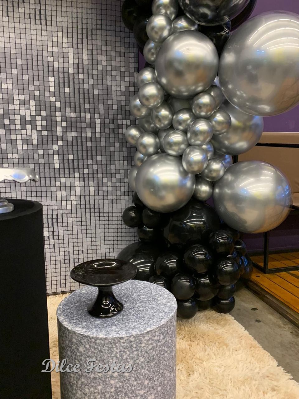 Festa com Painel de Glitter Prata – Trabalho em Balões Preto e Prata com Arco Orgânico