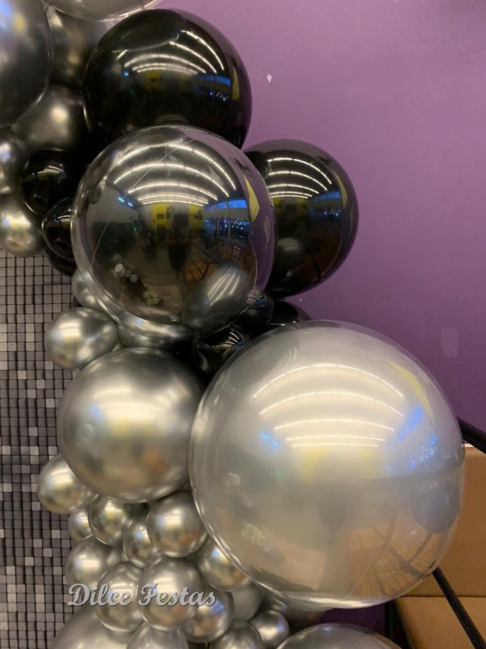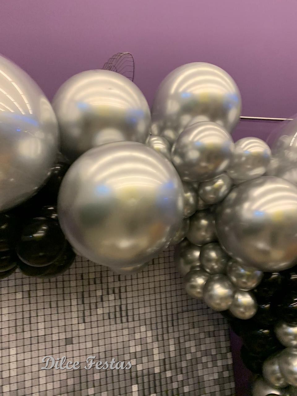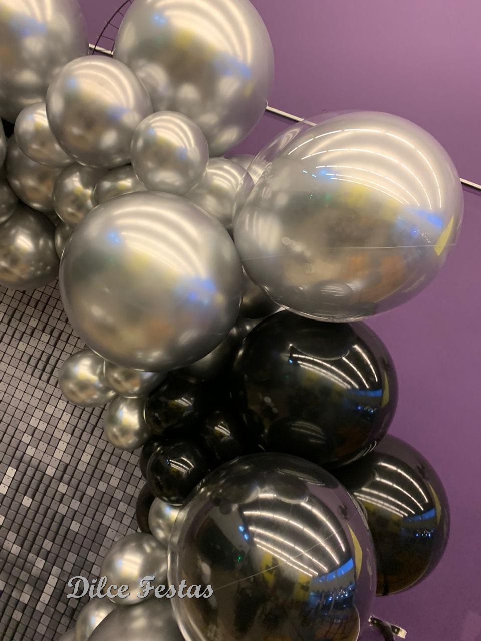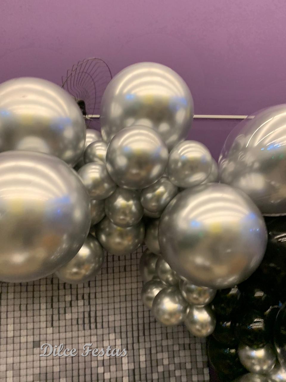 Festa com Painel de Glitter Prata – Trabalho em Balões Preto e Prata com Arco Orgânico