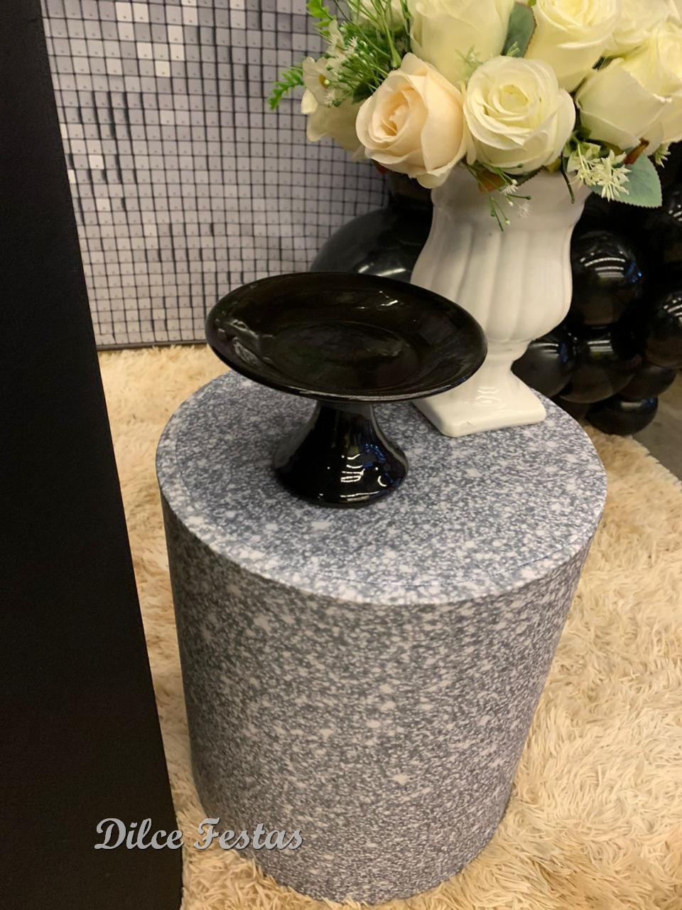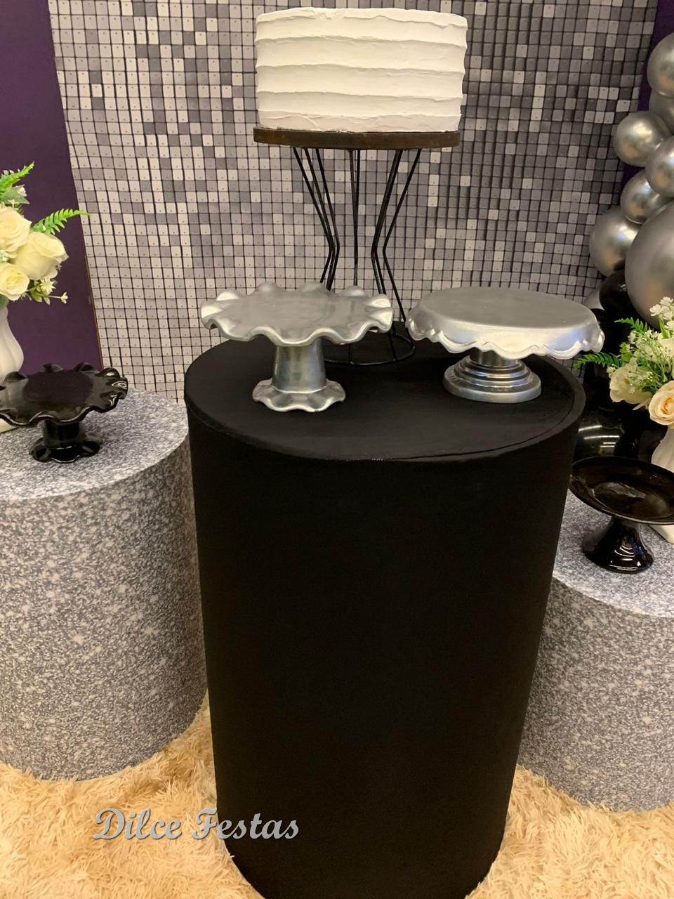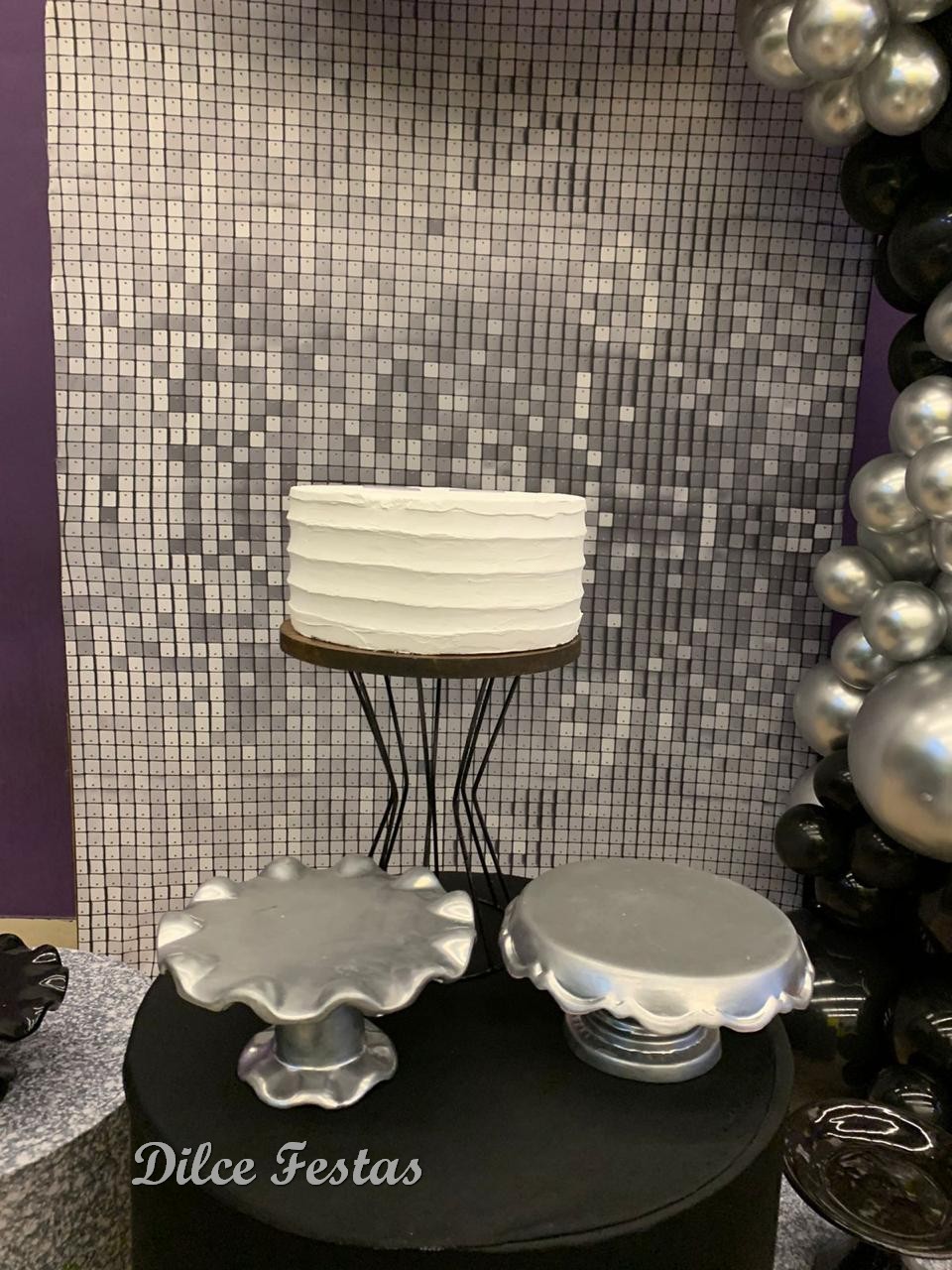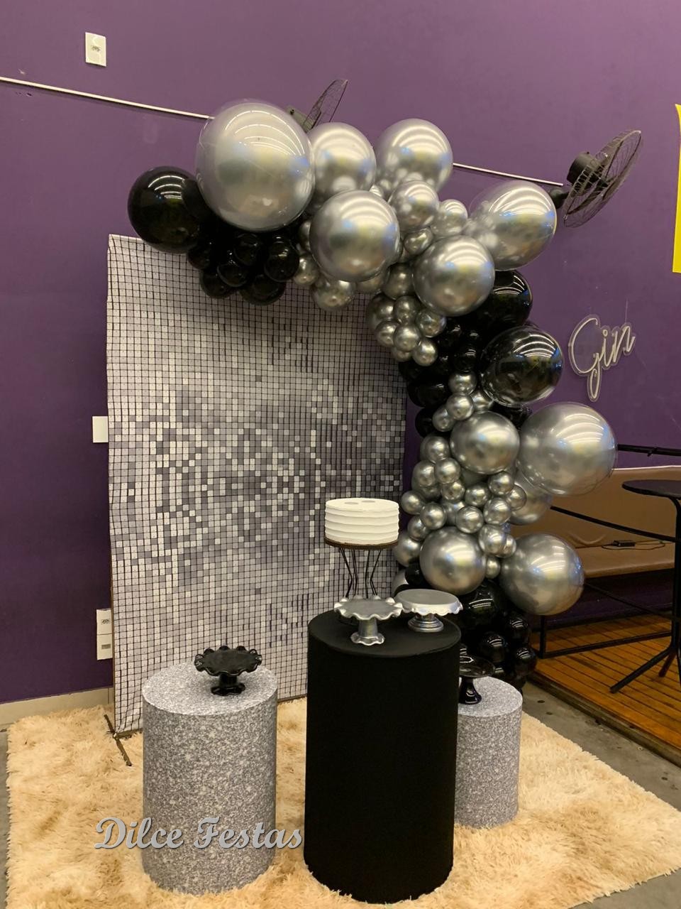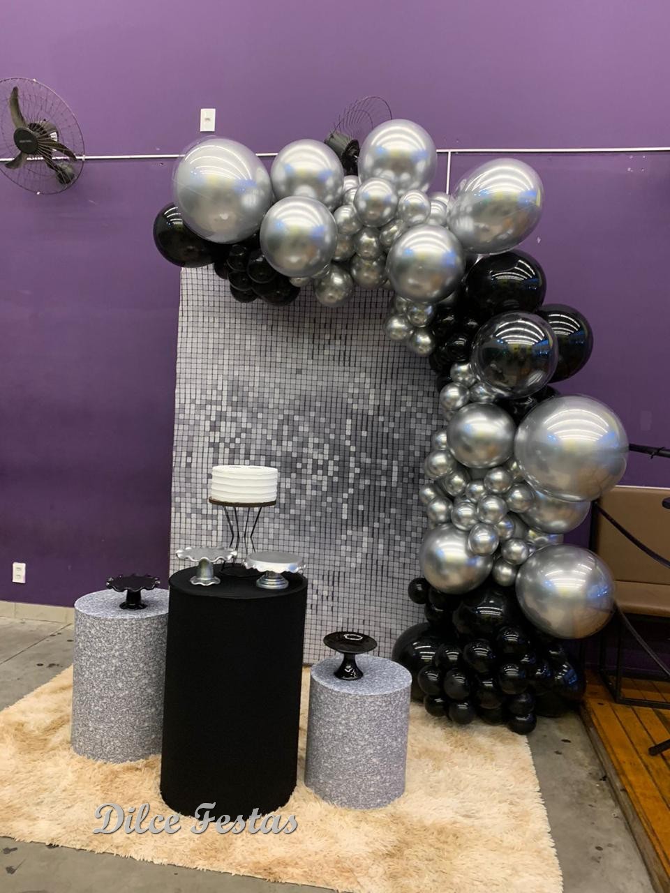 Festa com Painel de Glitter Prata – Trabalho em Balões Preto e Prata com Arco Orgânico