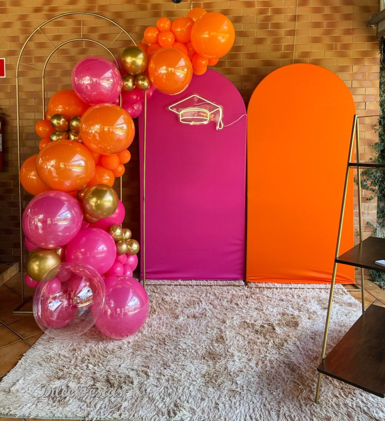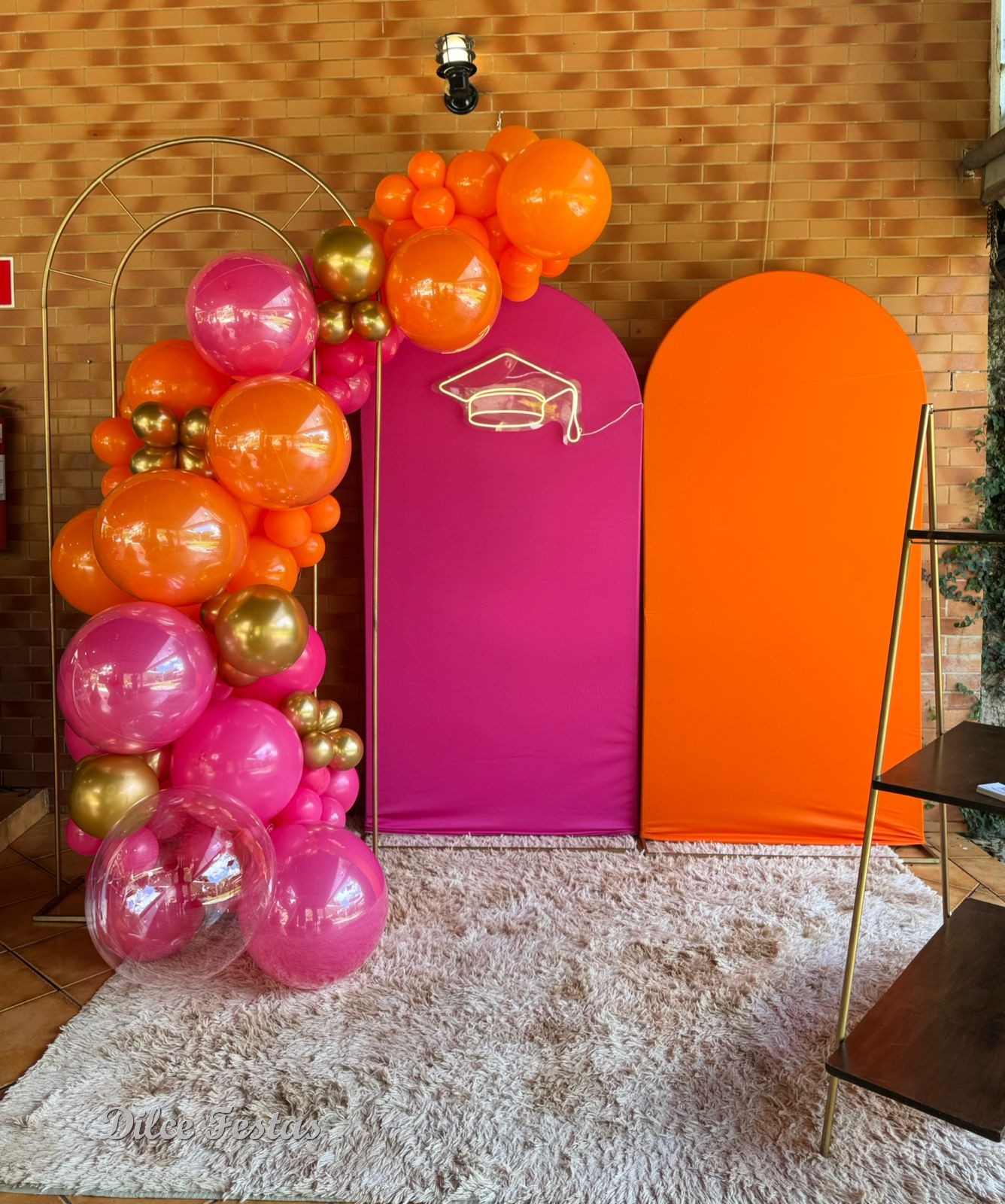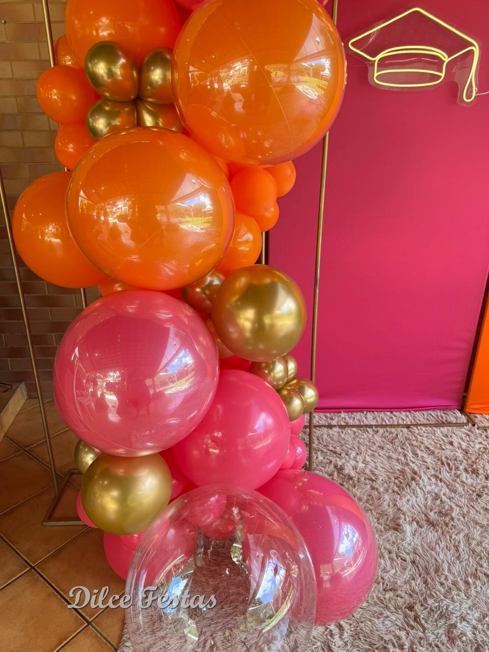 Formatura Painel Oval Pink e Laranja Liso Capelo de Led – Trabalho em Balões com Arco Orgânico