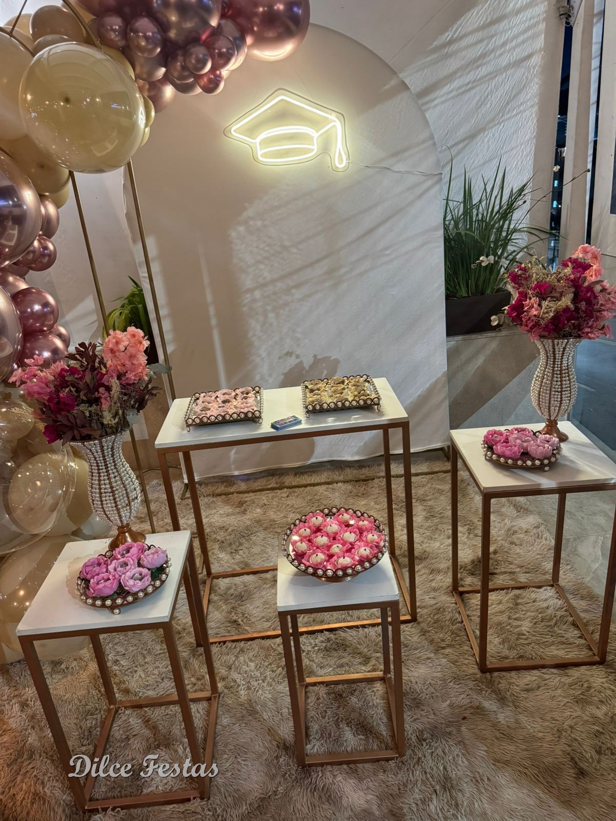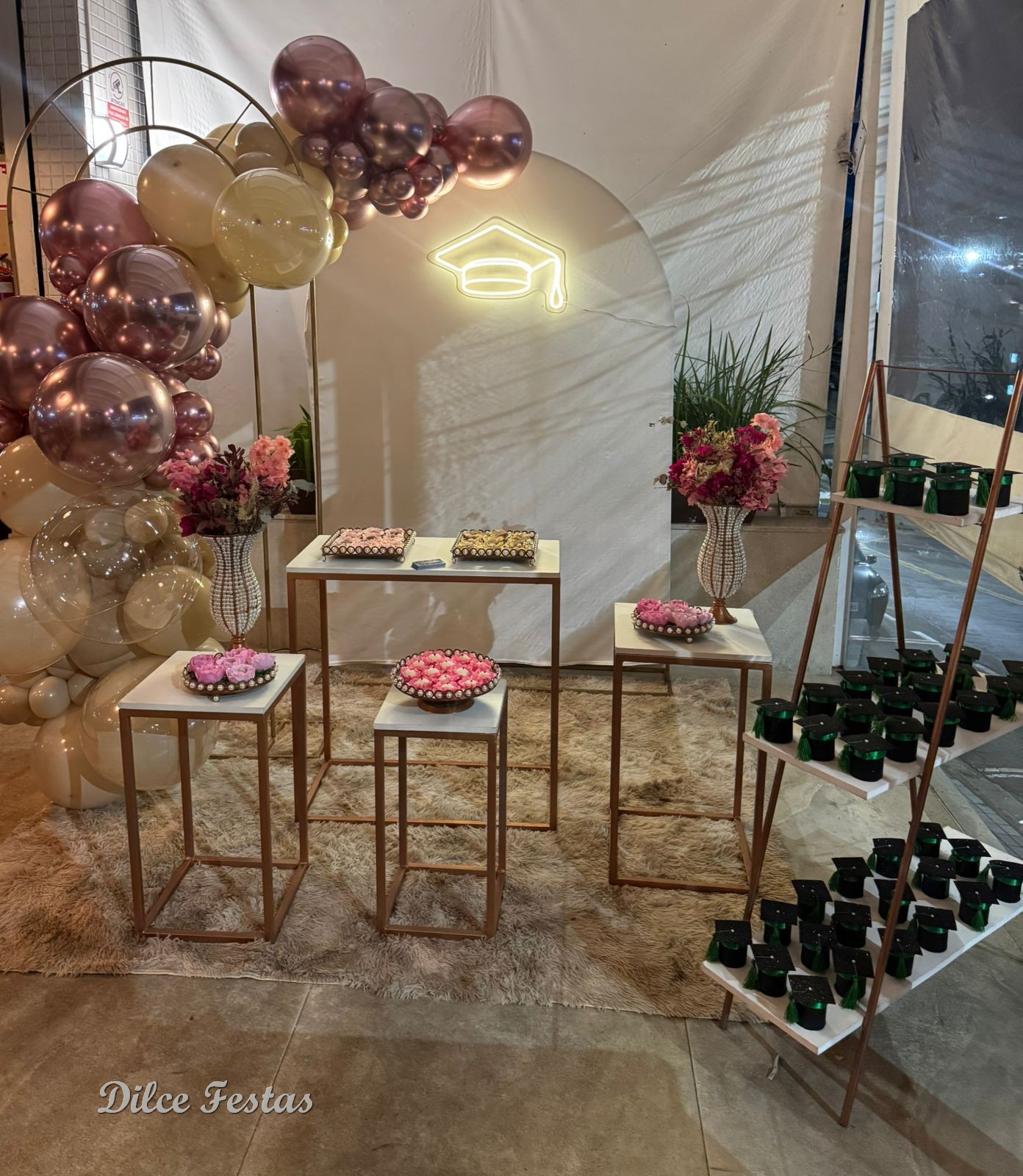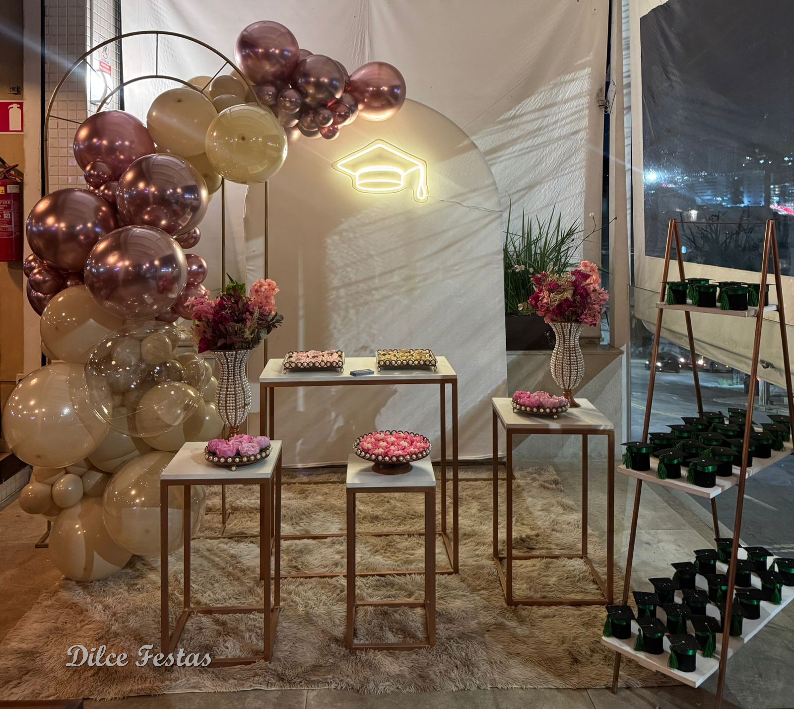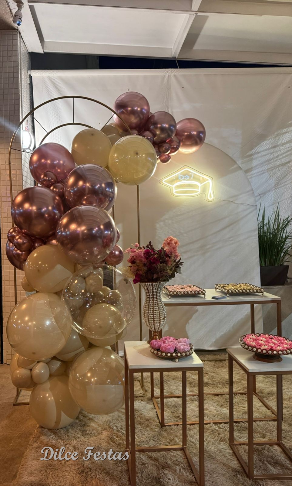 Formatura Painel Romano/Oval Off White – Trabalho em Balões com Arco Orgânico Rose e Bege Areia